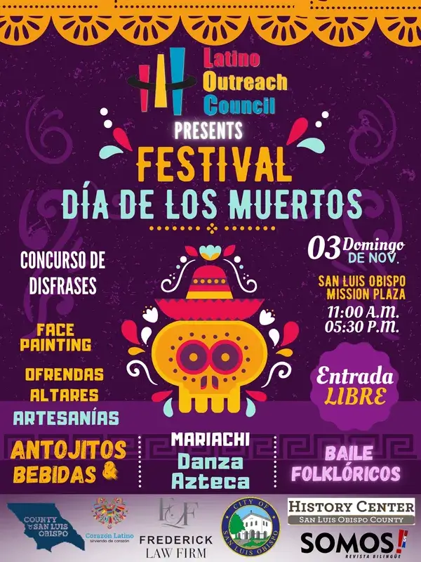 Join the Latino Outreach Council on Saturday November 1, 2025 from noon to 5:00 p.m in Mission Plaza for a celebration including Aztec Dancers, Folkorico dancers, a Day of the Dead Costume Contest, Mariachi performance, dancing in the Mission Plaza, vendor booths (food, beverages, community groups, artists, crafts), activities for children and more.